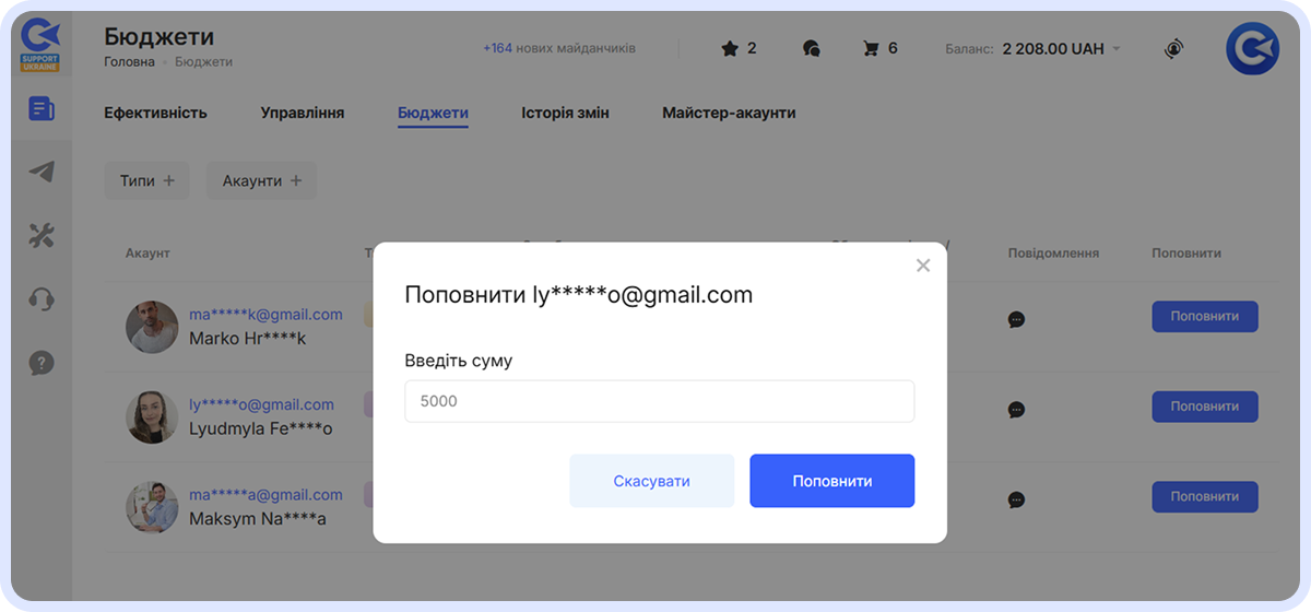 Ця вкладка потрібна для сценарію, коли необхідно з Майстра перенести гроші Колезі або Клієнту. Для цього оберіть відповідний обліковий запис, натисніть Поповнити та вкажіть суму. При цьому відсутні внутрішні комісії.