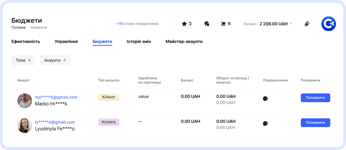 Підключивши Майстер-акаунт, ви отримуєте повний набір інструментів для управління роботою команди та клієнтів. Зокрема, ви можете: